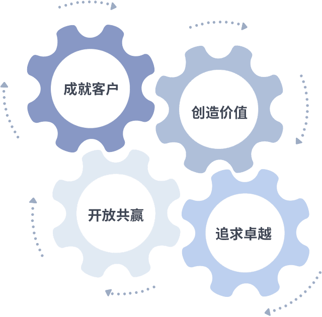 成就客户是一切决策的出发点,,,,创造价值是衡量所有工作的标准,,追求卓越是我们做事做人的态度,,,,开放共赢是我们的格局也是最终的结果。。价值观的齿轮环环相扣,,,,推动着组织里的每个人不断向前。。