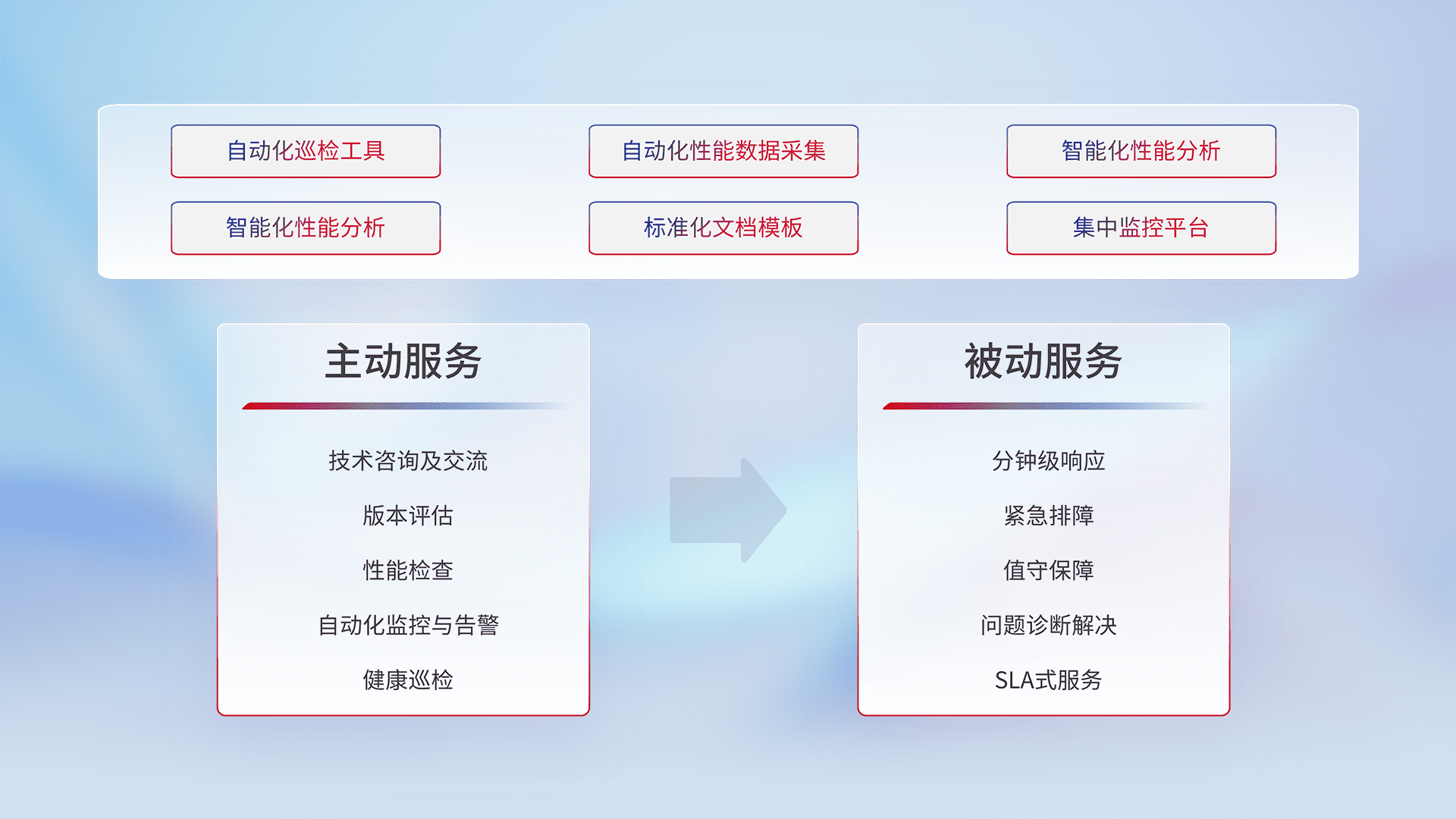 智能化工具和标准化文档,,,,保障服务质量,,,提供主动服务(包含技术咨询、、版本评估、、性能检查、、自动化监控与告警、、、健康巡检)和被动服务包含(分钟级响应、、紧急排障、、、值守保障、、问题诊断解决、、、、SLA服务)。。